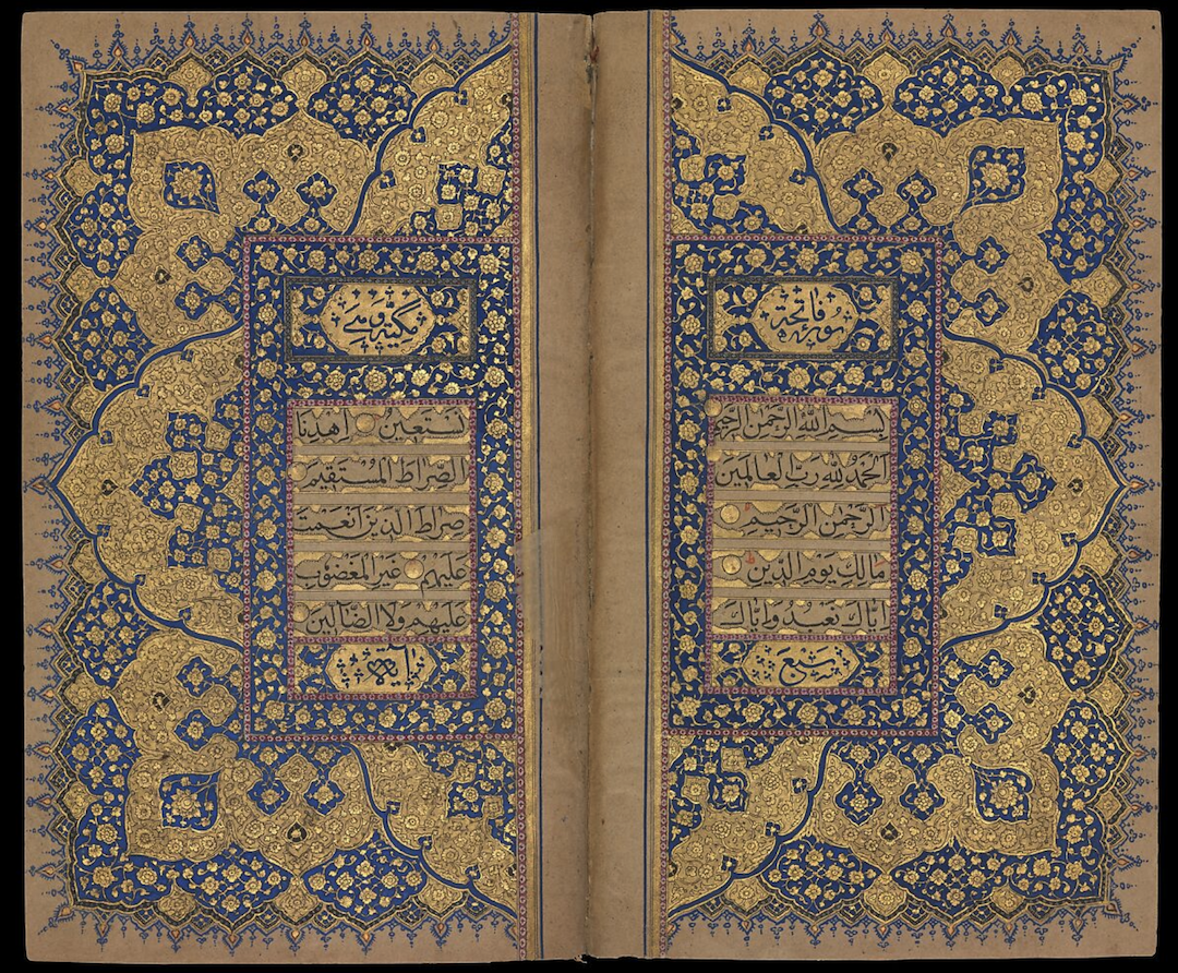 Late 18th / Early 19th century illuminated pages from a Qur’án, for a story about the Báb requesting treatises drawn from the Qur’án and Ḥadíths from 40 of His desciples. Source: The Met.