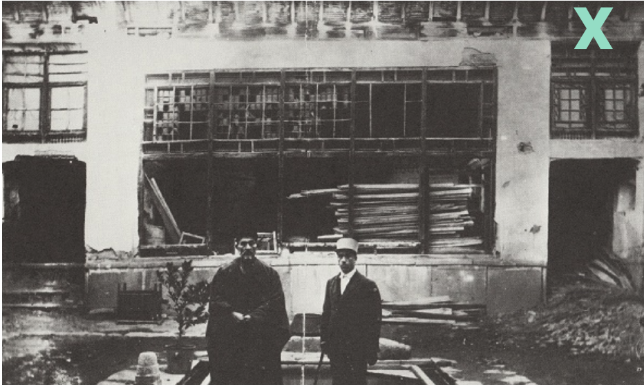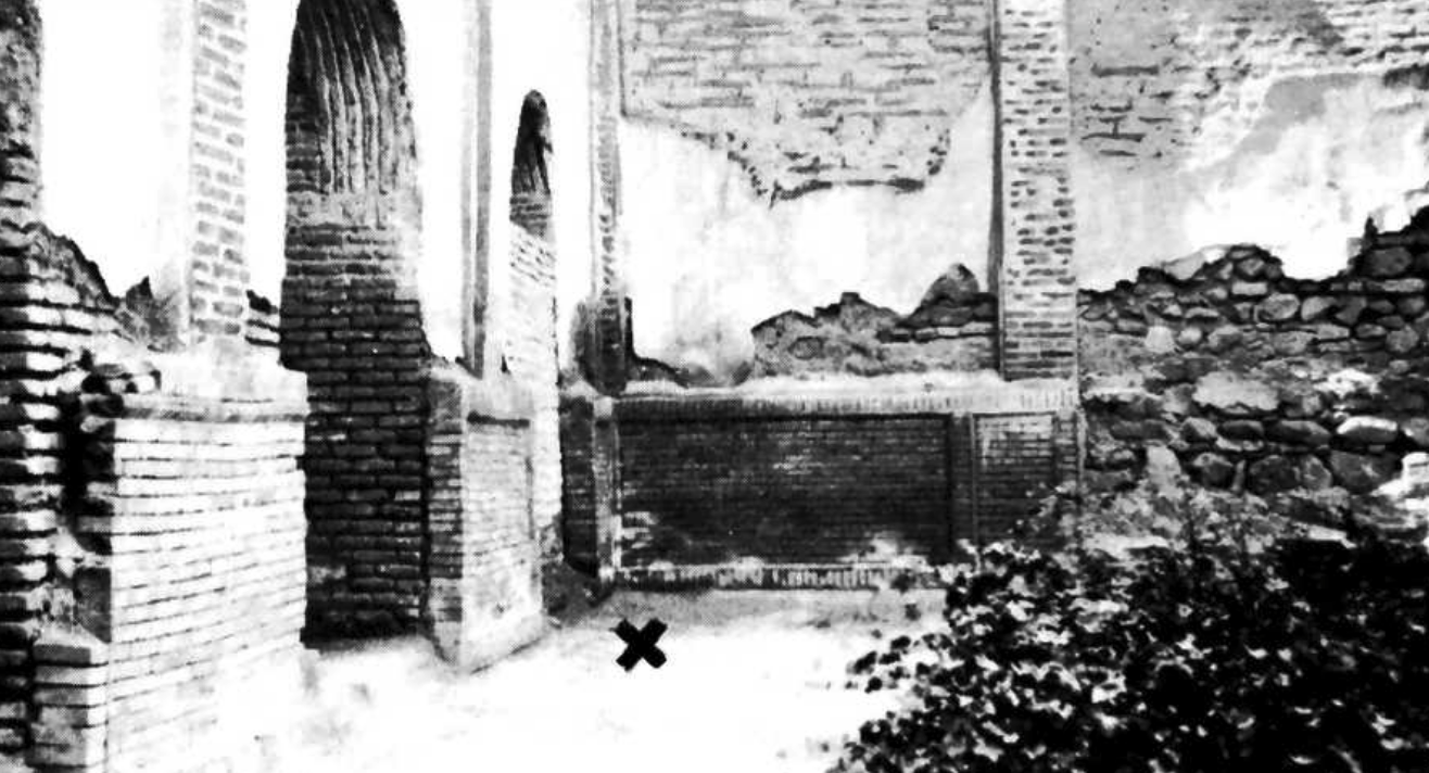 The Governor’s Court in Urúmíyyih; the light green ‘X’ on the top right above the window indicates the upper room (Persian: bálá-kháneh) occupied by the Bab during his stay. Source: Nabil, The Dawn-Breakers, page 310.