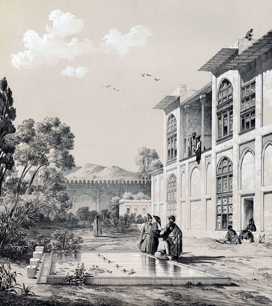 A view of the city that both the Báb and Khadíjih Bagum grew up in. The Arg, the citadel of Karim Khán in central Shíráz in the 1840s from Voyage en Perse, avec Flandin, éd. Gide et Baudry. Source: Wikimedia Commons.