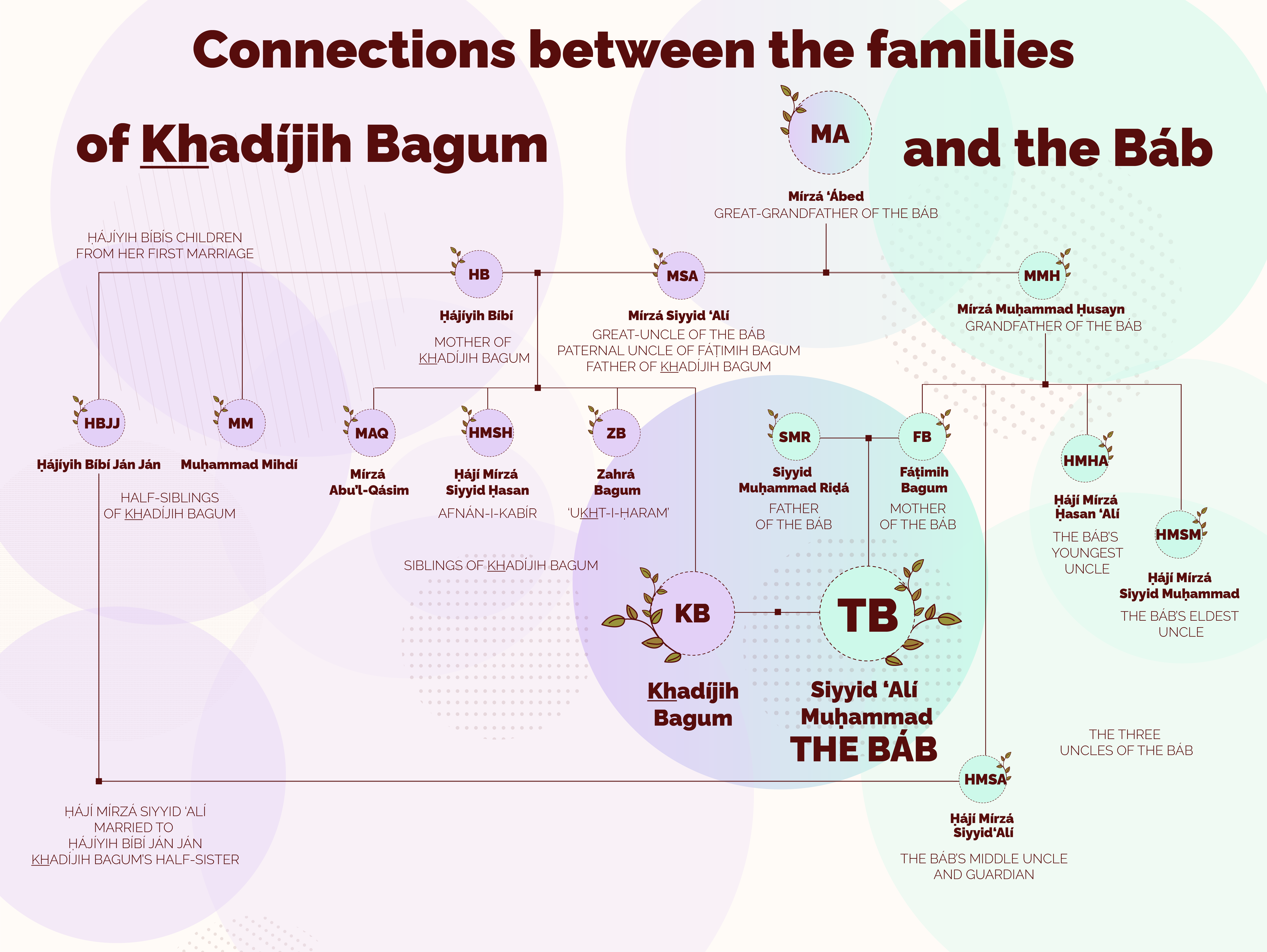 Because of the similarity in name of Khadíjih Bagum’s father, Mírzá Siyyid ‘Alí, and the Báb’s uncle and guardian, Ḥájí Mírzá Siyyid ‘Alí, and because the families of Khadíjih Bagum and the Báb are connected in several ways, this section is meant to make the relationships clear.
