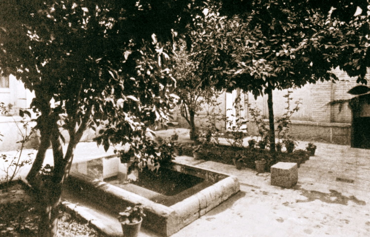View of the garden in the courtyard of the House of the Báb in Shiraz, where Ḥájí Mubárak lived. On the right, towards the center, is seen the entrance from an adjoining dwelling.(The Baha'i World 1976-1979). Source: Baha'i Points of Interest.