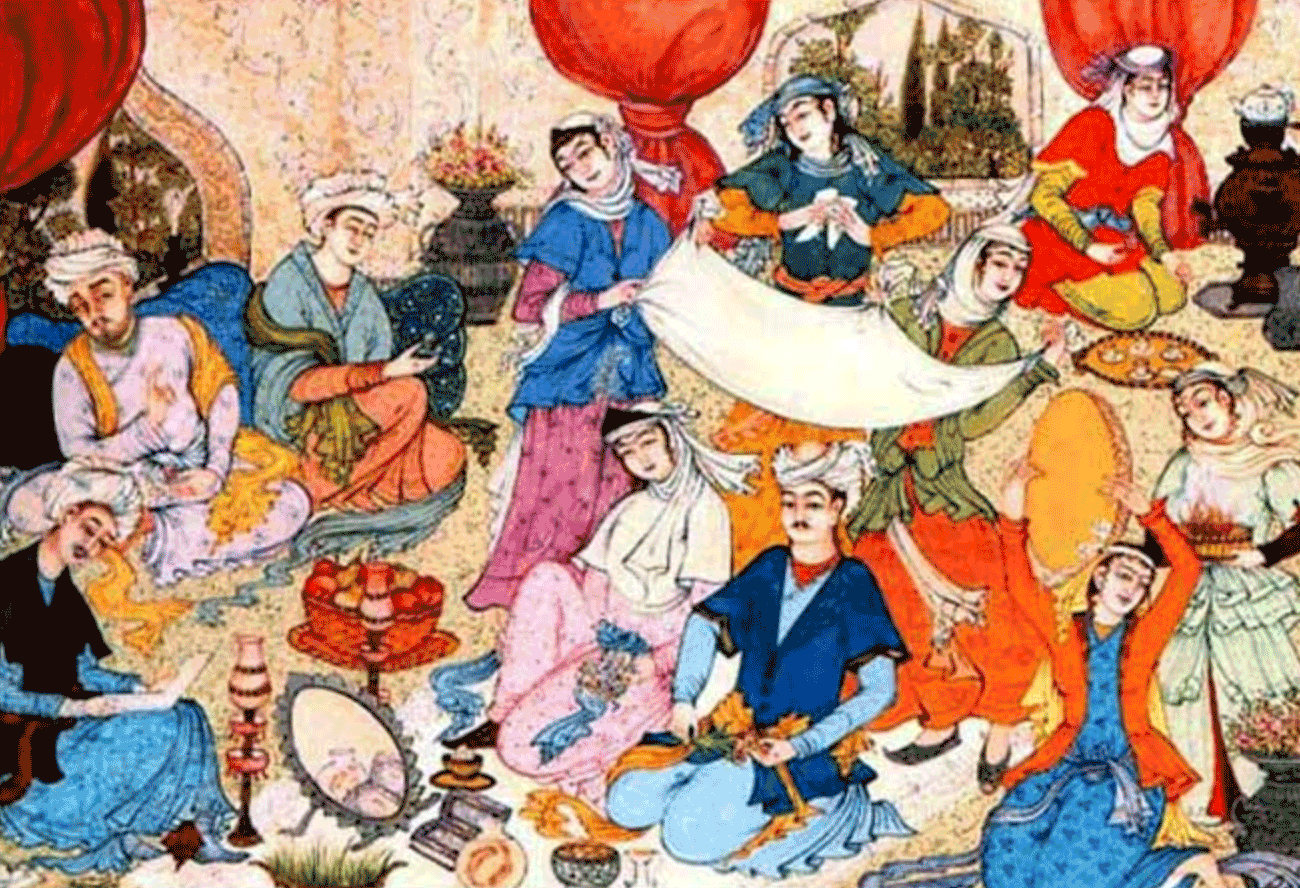 The feeling of joy and happiness in a Persian wedding, conveyed by the colorful Persian painting of a Persian wedding ceremony (undated). Source: Wikimedia Commons.