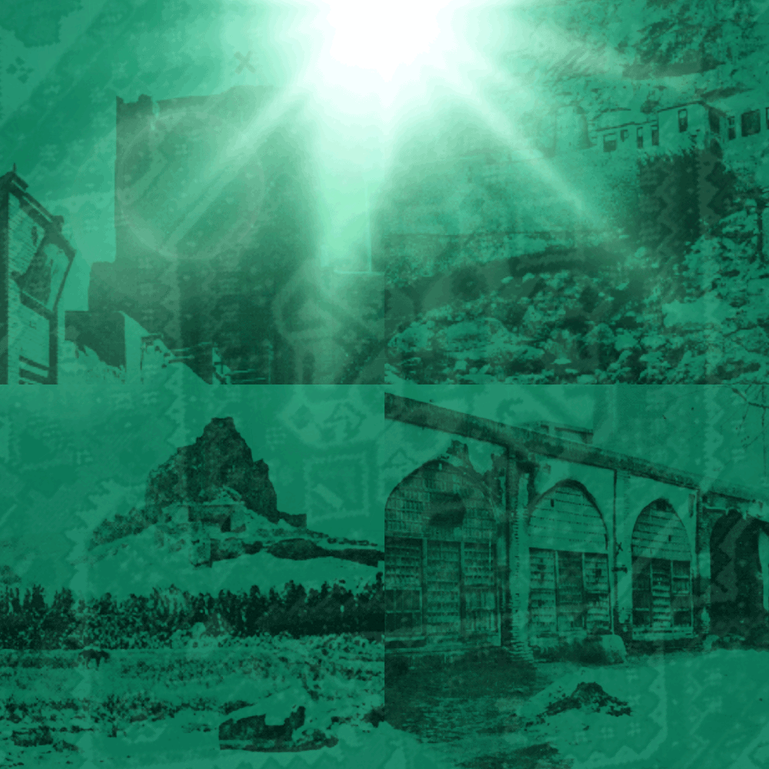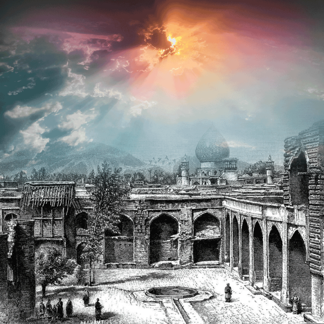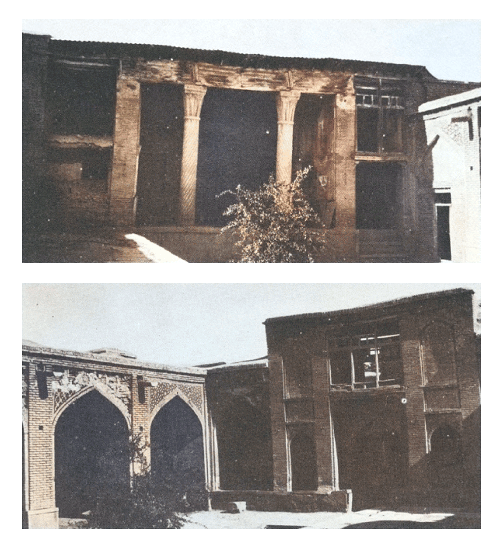 Two views of the Masjid-i-Ílkhání, where Mullá Ḥusayn’s companions are waiting for him, colorized for this chronology by Violetta Zein. Original images: Nabil, The Dawn-Breakers, page 60.