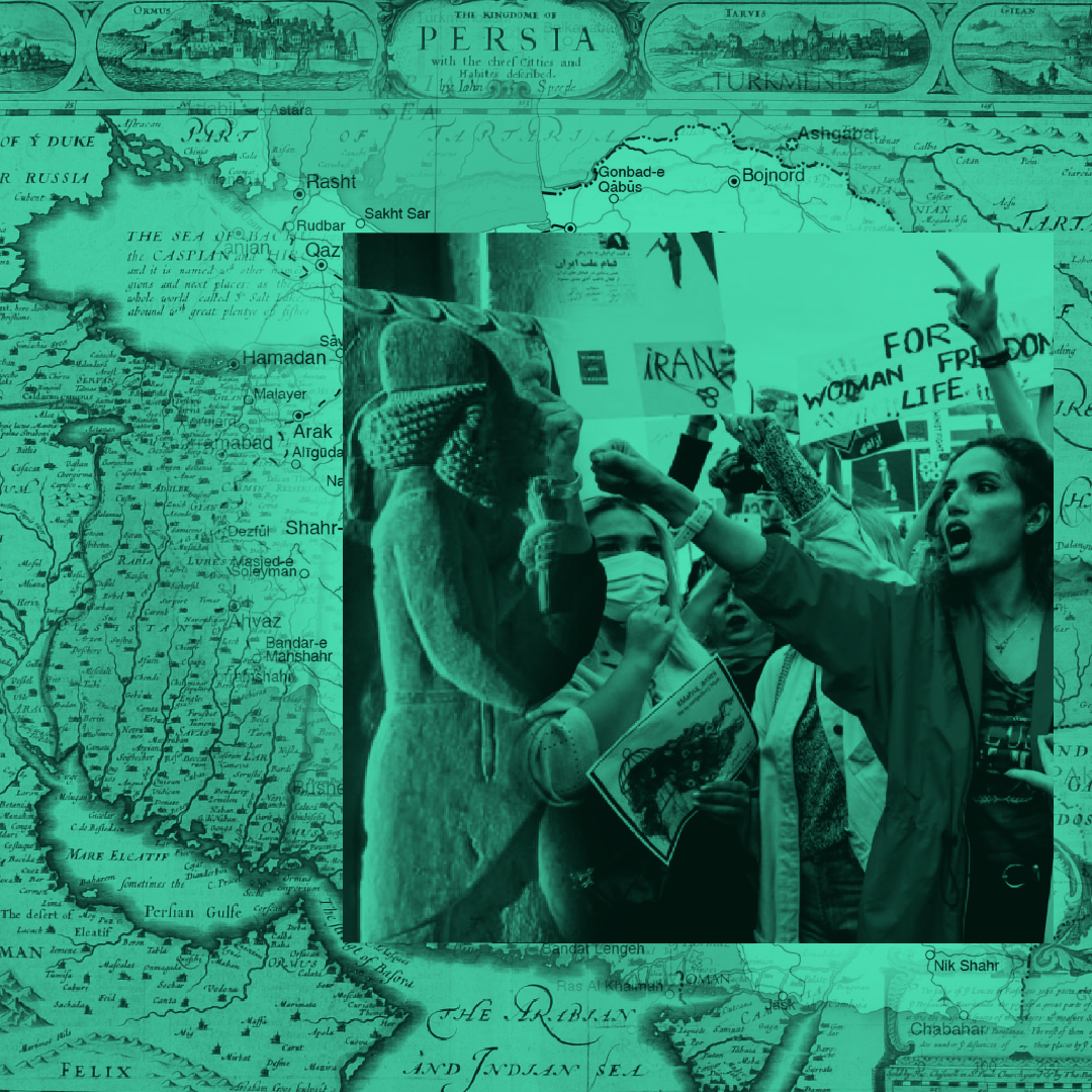 “History”: A blend of Persia’s ancient past and Iran’s present in ancient engravings and news pictures, over two maps, a 17th century map of Persia and a , to symbolize an ever-evolving historical understanding of past events. © Violetta Zein