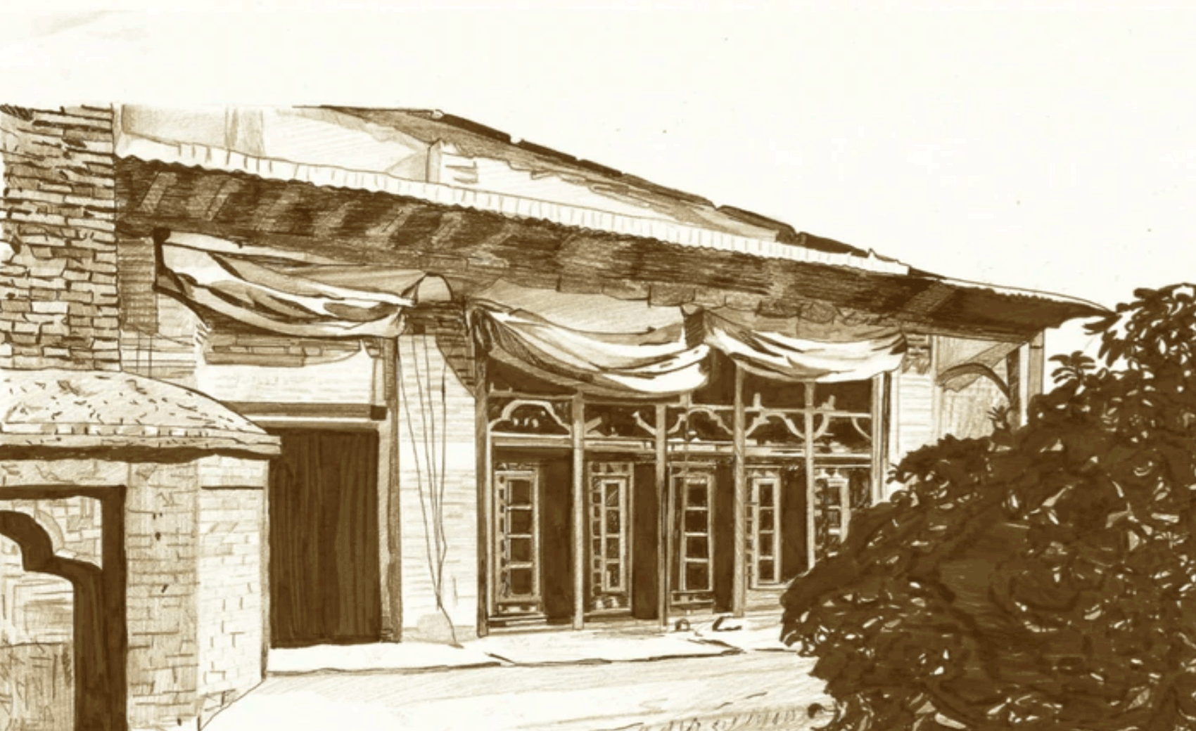 An ink drawing of the house of the Báb in Shíráz which was destroyed in 1979. Source: A Most Dramatic Chapter in the Spiritual History of Humankind: A Pictorial Essay by Julio Savi published in Bahá'í World 2020-05.