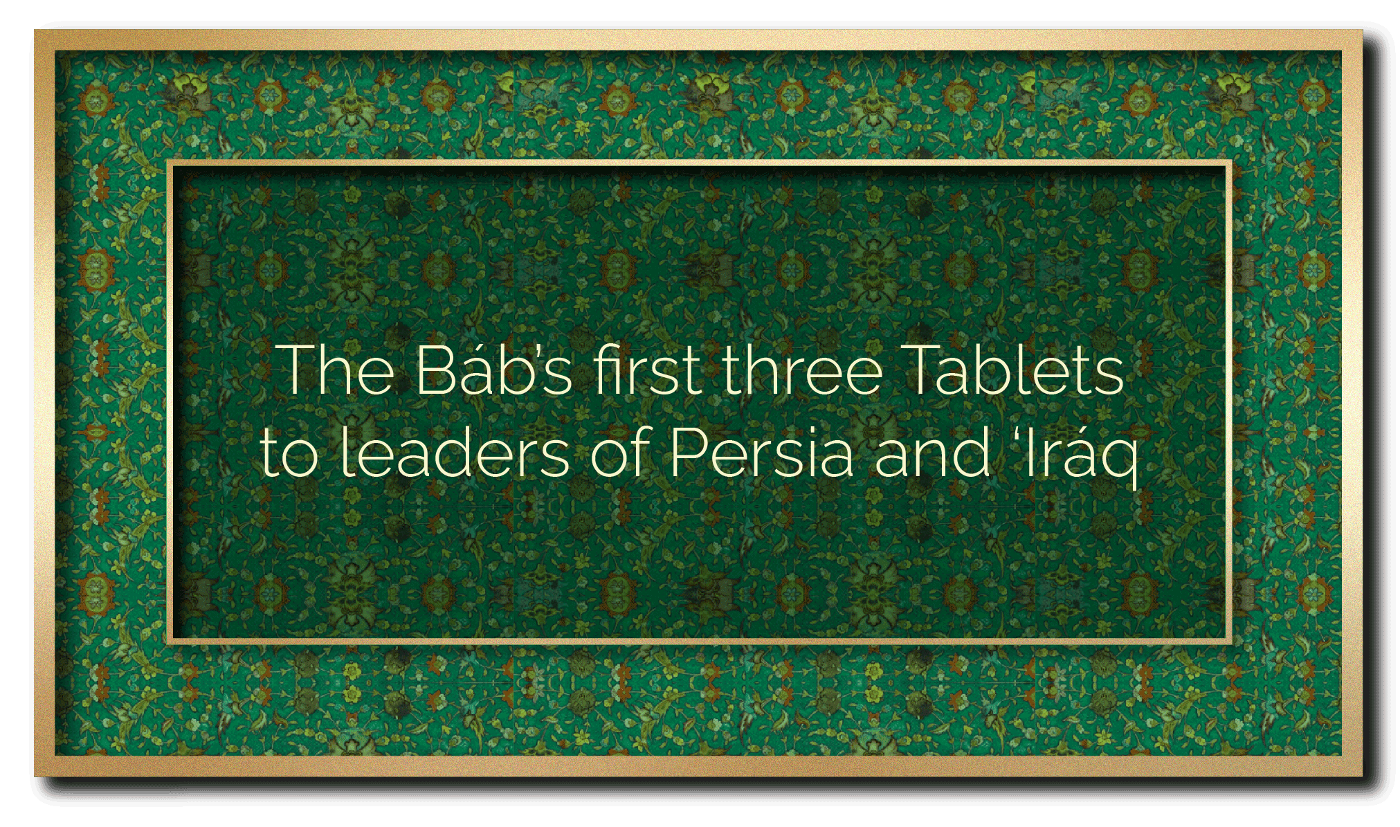 One of the first acts of the Báb after His Declaration was to write Tablets to three leaders of 'Iráq and Persia: Shaykh Muḥammad-Ḥasan al-Najafí of 'Iráq, and Muḥammad Sháh and Ḥájí Mírzá Áqásí the sovereign and Prime Minister of Persia.