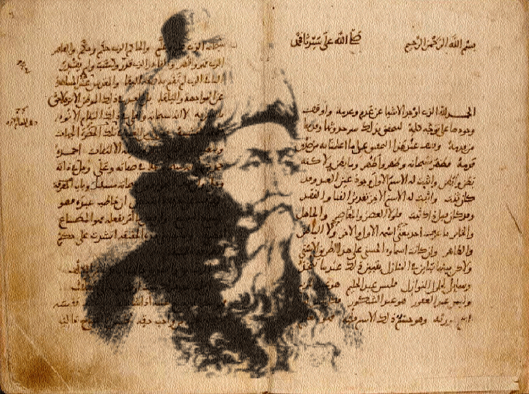 The only image of Ibn ‘Arabí we have, superimposed over the opening pages of the Konya manuscript of the Meccan Revelations, handwritten by Ibn ‘Arabí between 1203 -and 1240. The Meccan Revelations are where many of his prophecies about the Báb originate. © Violetta Zein Source of manuscript photo: Wikimedia Commons; source of drawing of Ibn ‘Arabí: Wikimedia Commons.