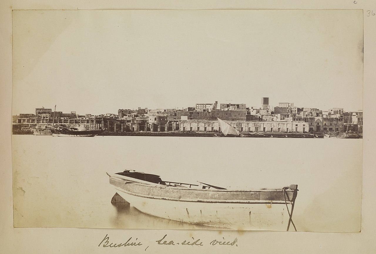 General view of the sea-front at Búshihr. A dhow with a lateen sail can be seen immediately to the right of the center along the horizon. The highest structure along the horizon is a wind tower, which can be seen right of center. In the foreground is a boat at anchor. Taken by an unknown photographer around 1870. Source: Wikimedia Commons.