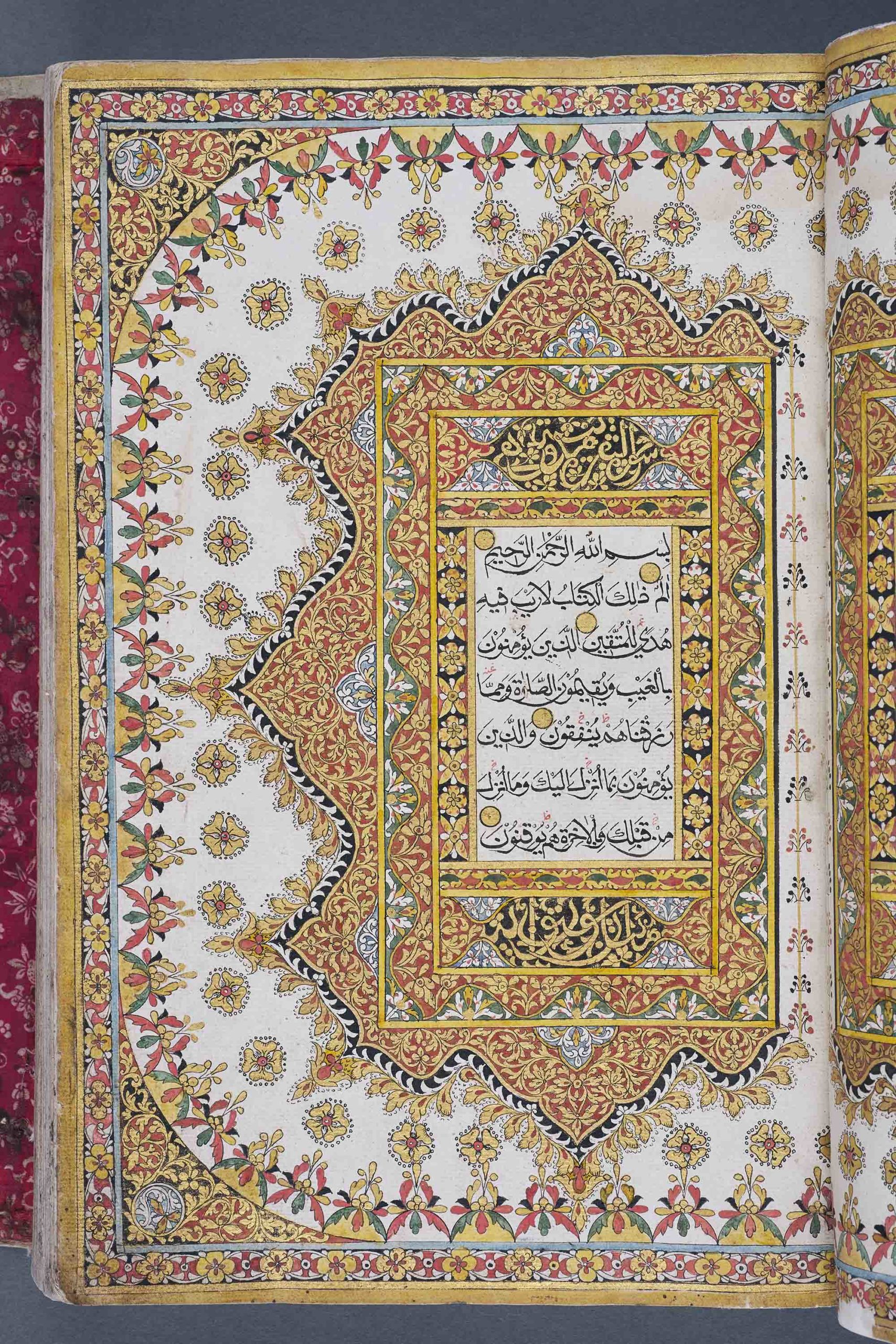 Left-side of a double-page opening of the Qur’án from Terengganu with beginning of the chapter Al-Baqara (the Súrih of the Cow). End of the 18th or 19th century. Asian Civilisations Museum: Source: Wikimedia Commons.