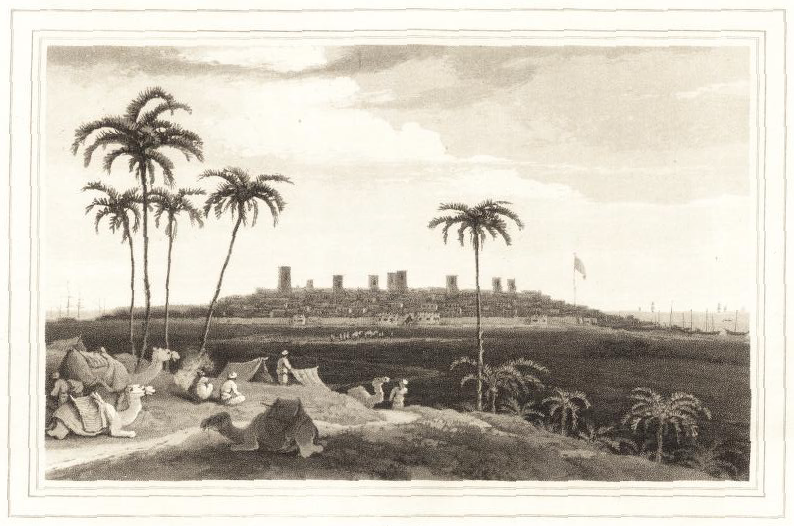 View of Búshihr from "A journey through Persia, Armenia, and Asia Minor, to Constantinople, in the years 1808 and 1809 : in which is included, some account of the proceedings of His Majesty's mission, under Sir Harford Jones, Bart. K. C. to the court of the King of Persia" by James Justinian Morier. Source: Wikimedia Commons.