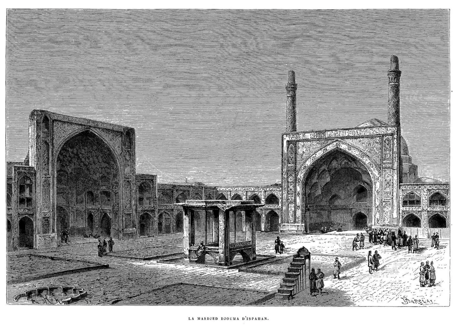 An engraving of Masjid-i-Ju'míh, where the Báb prayed in Iṣfahán. Source: Jane Dieulafoy, La Perse, la Chaldée et la Susiane, page 307. Source : Archive.org.