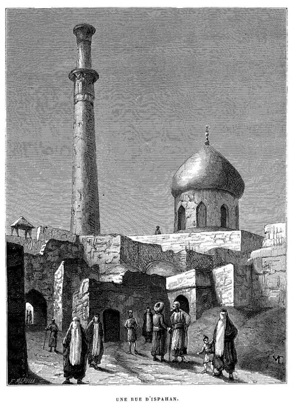 Engraving of a street in Iṣfahán from Jane Dieulafoy, La Perse, la Chaldée et la Susiane, page 275. Source : Archive.org.