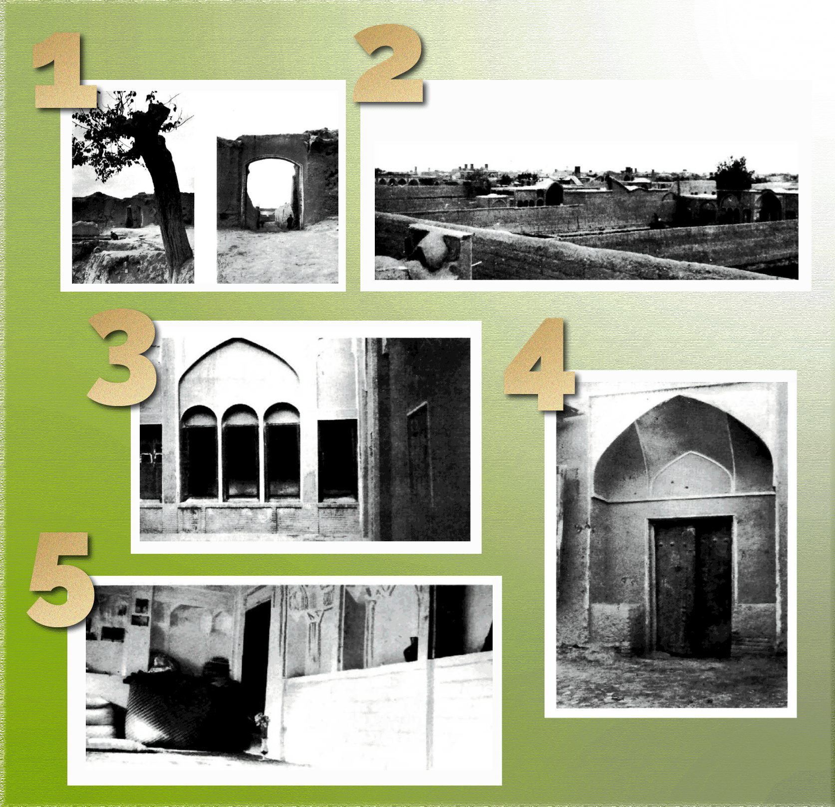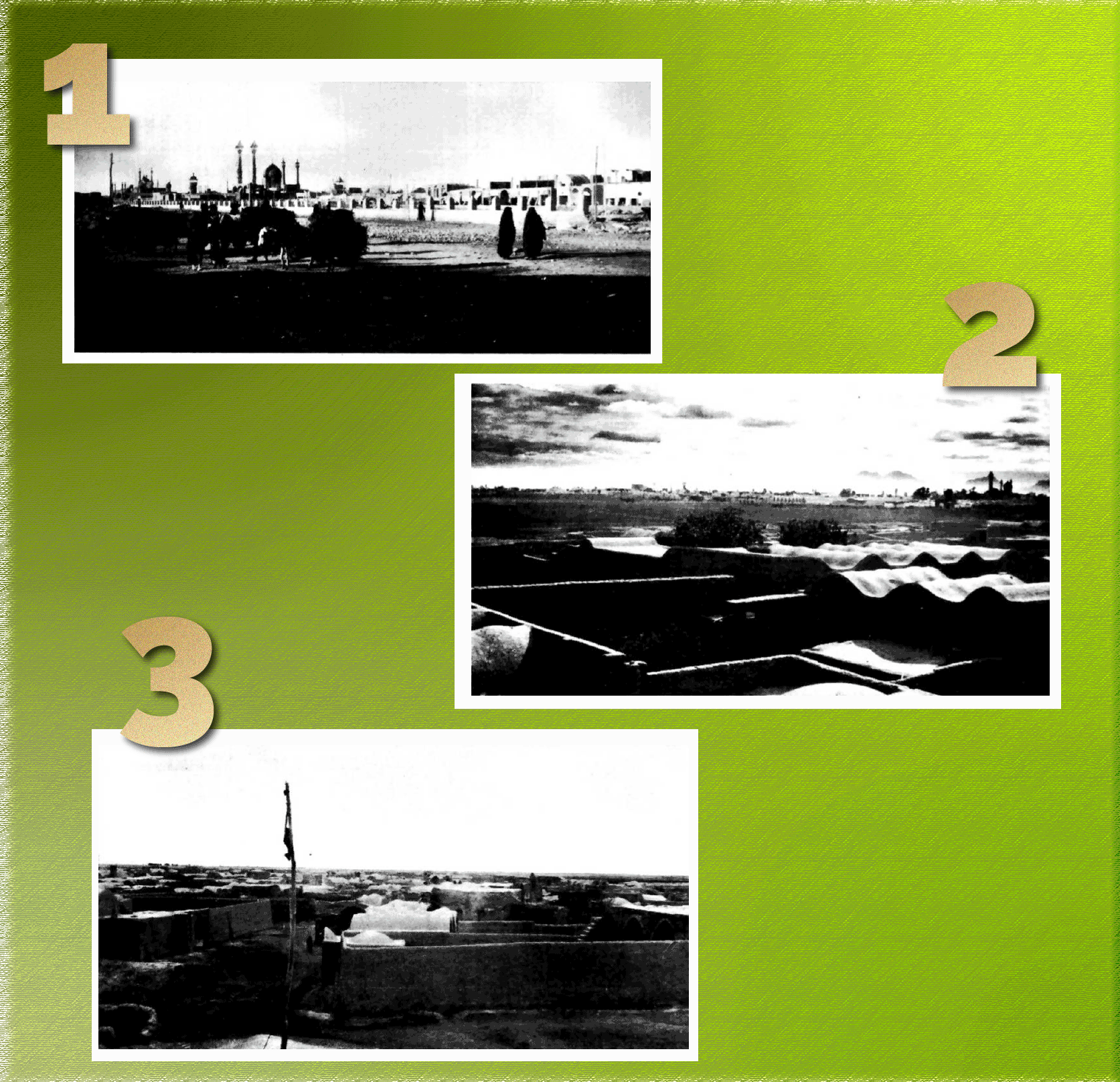 Three views of the Báb’s journey from Iṣfahán to Qumrúd: Photos 1 and 2: Two views of Qum, showing the Ḥaram-i-Ma'súmih, the Holy Shrine of Fáṭimih, the sister of the Eighth Imám; Photo 3: The village of Qumrúd. Source: Nabil, The Dawn-Breakers, pages 223-225.