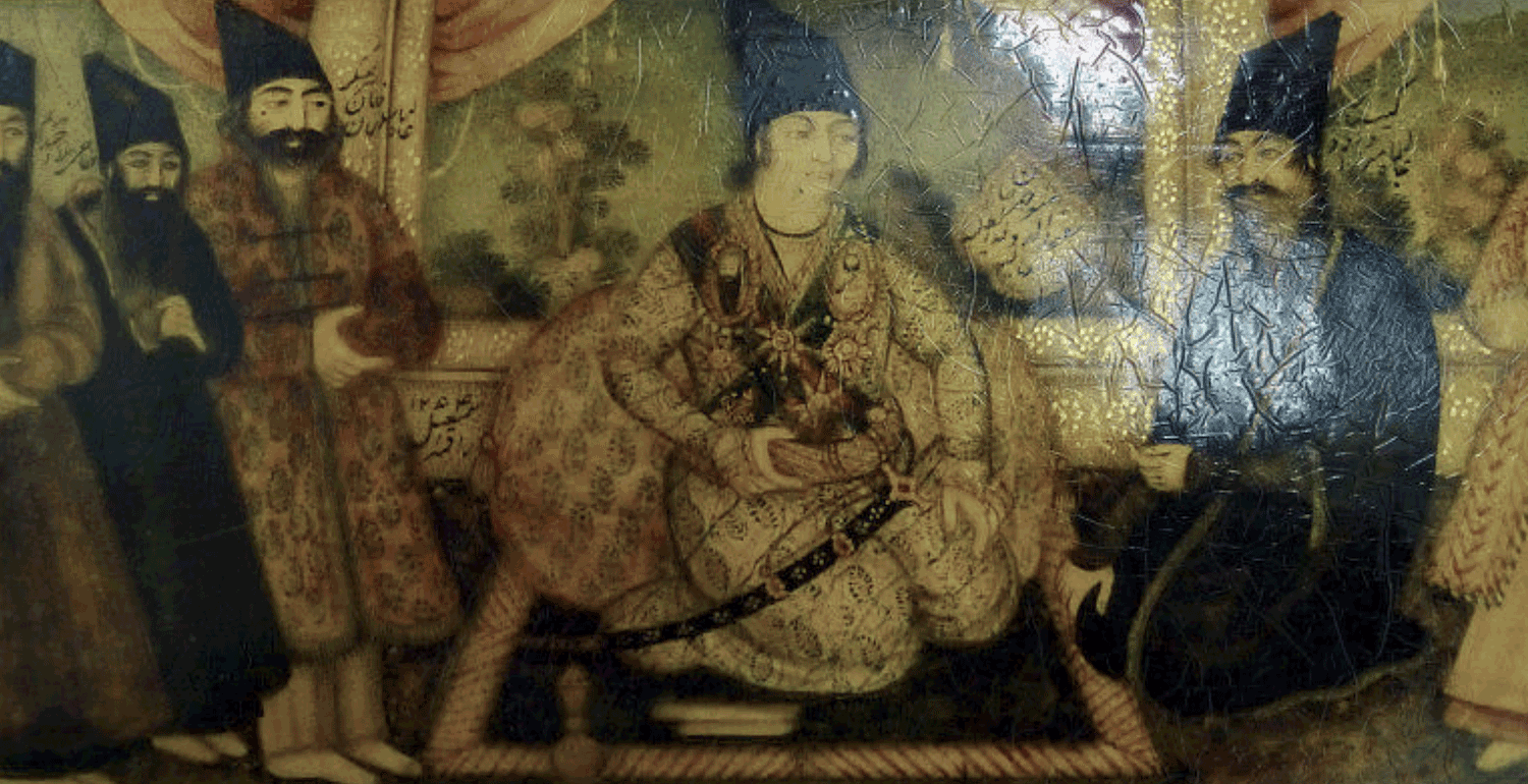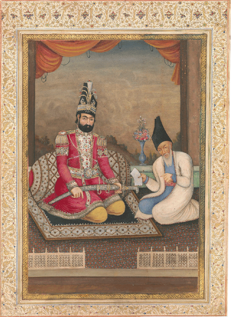 A mid-19th century portrait showing both characters referenced in the story below: Muḥammad Sháh and the scheming Ḥájí Mírzá Áqásí, his Prime Minister. Source: Wikimedia Commons.