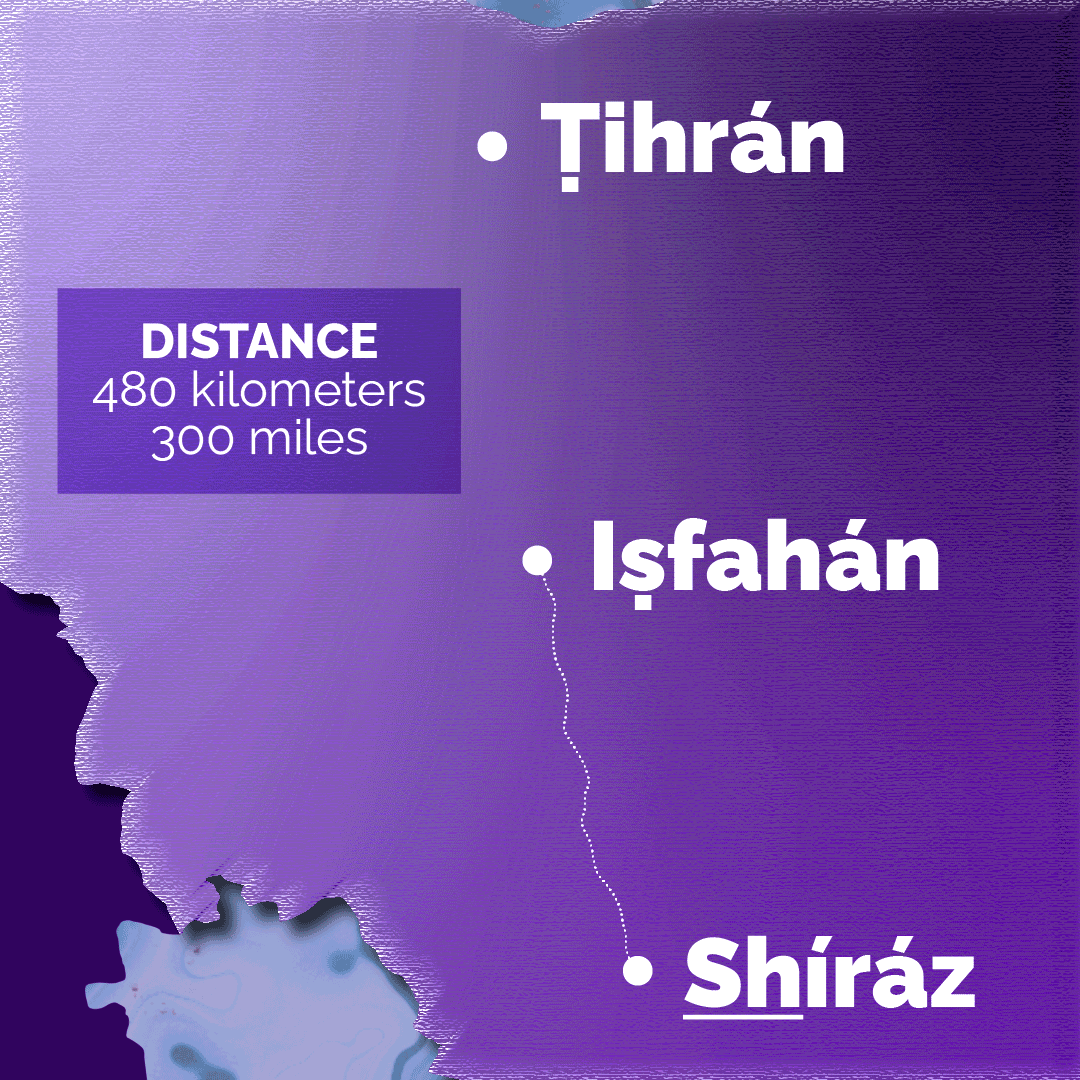 Distance map between Shíráz and Iṣfahán, showing the relationship of the two cities to Ṭihrán. The route is symbolic, as we have no historical information on the route taken by the Báb. © Violetta Zein