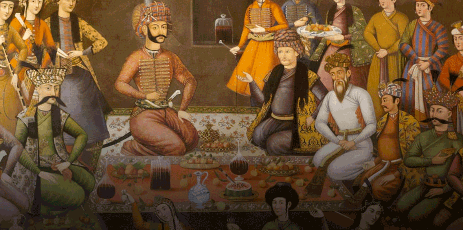 For a story about a dinner in Qajár Iṣfahán, a detail of a Fresco at Chehel Sotoun Palace in Iṣfahán of a dinner with Sháh ‘Abbás. Source: Wikimedia Commons.
