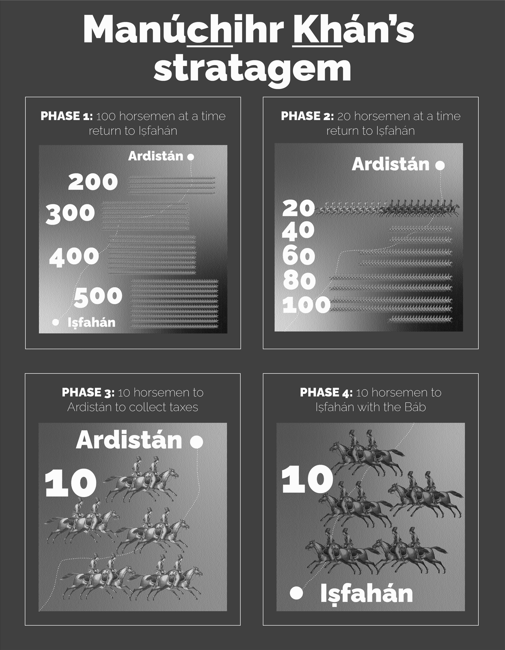 “Manúchihr Khán’s stratagem”: An infographic of Manúchihr Khán’s strategy to fake the Báb’s departure from Iṣfahán and return Him safely to the city under cover of darkness, detailed in the story below. © Violetta Zein