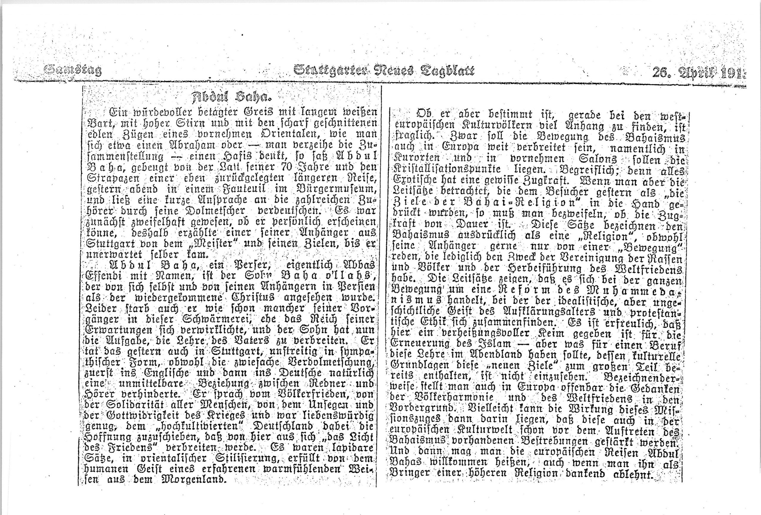 - 25 April 1913: ʻAbdu’l-Bahá speaks at the Bürgermuseum (the People's museum), for a second time, in Stuttgart