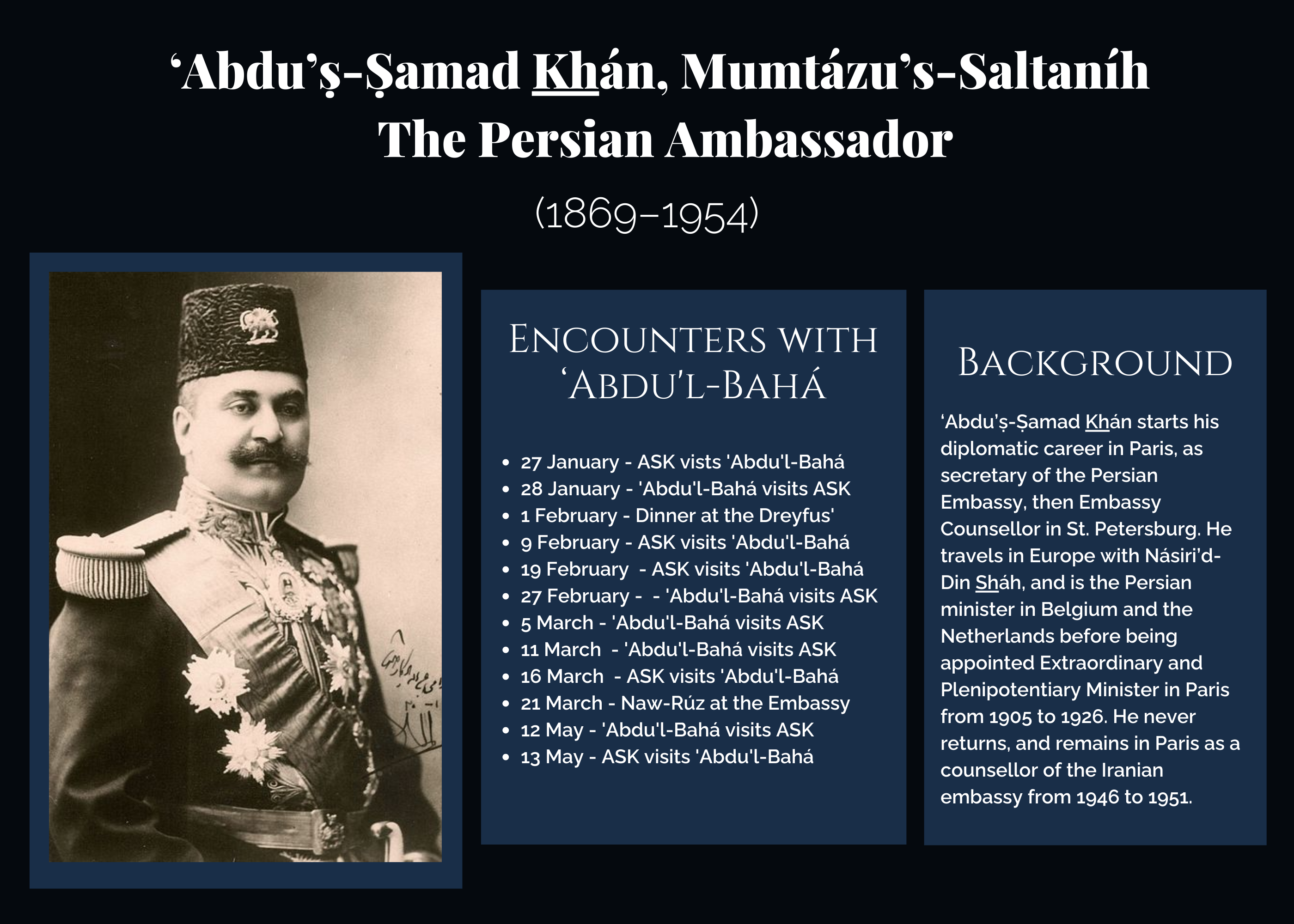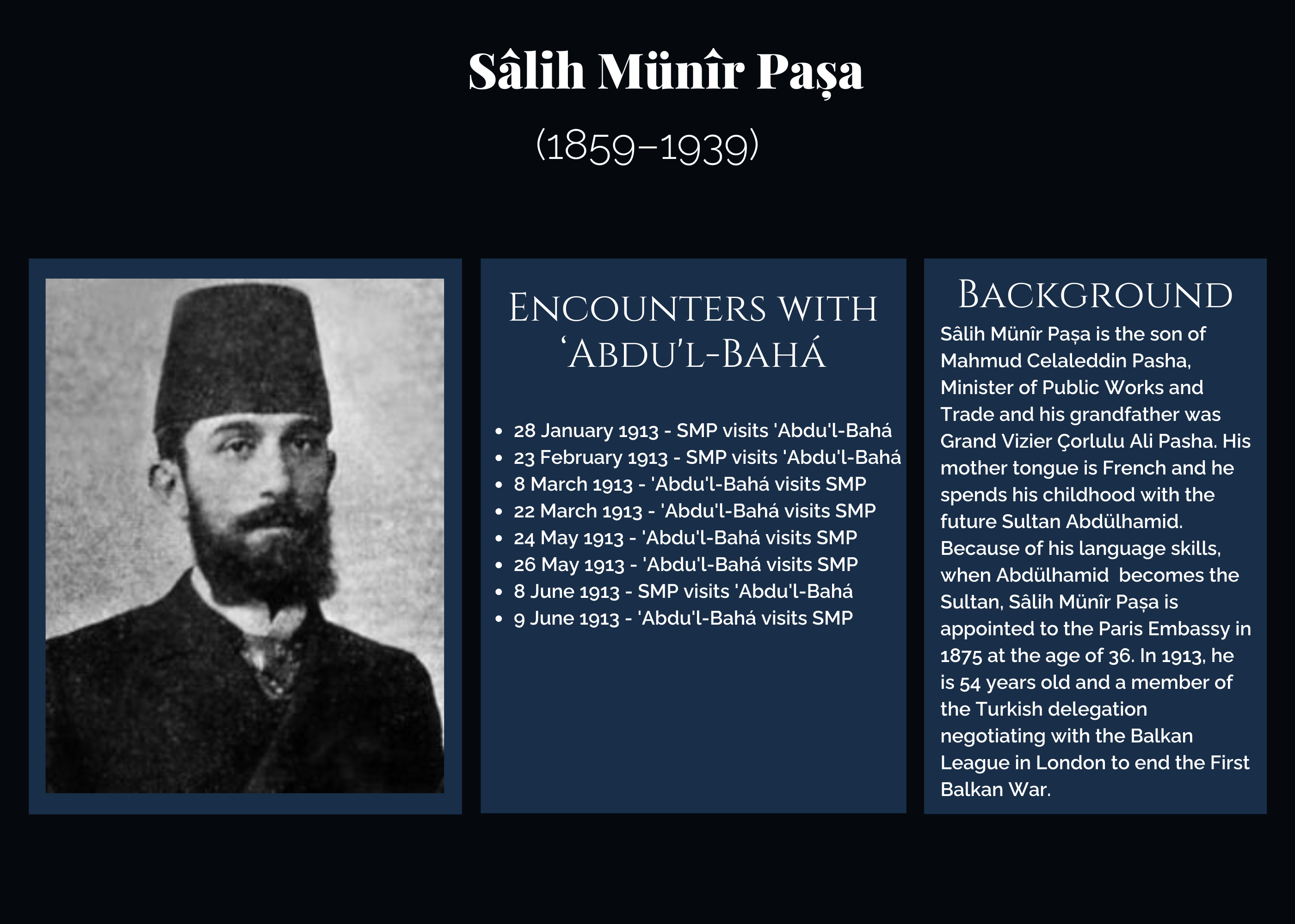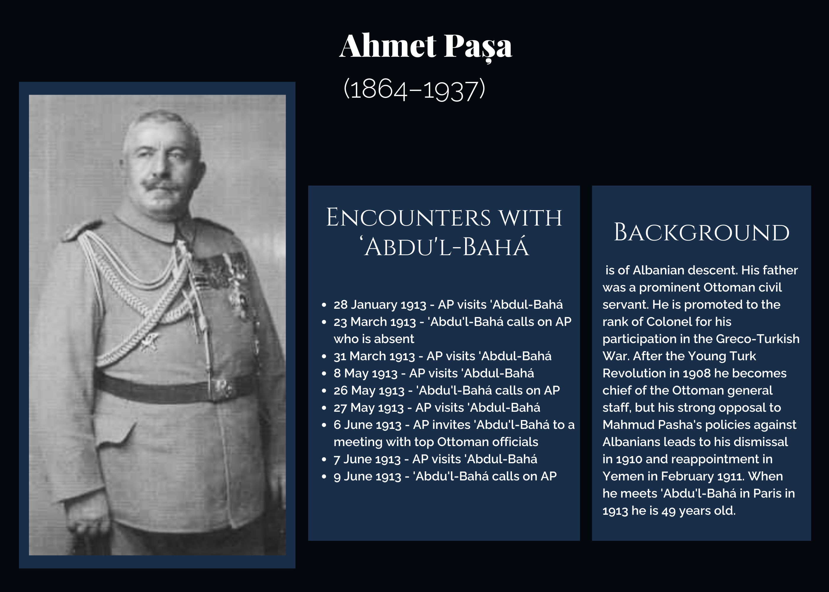 - 6 June 1913: Ahmed Izzet Pasha, the former Grand Vizier of the Ottoman Empire, gives a dinner party in honor of ‘Abdu’l-Bahá