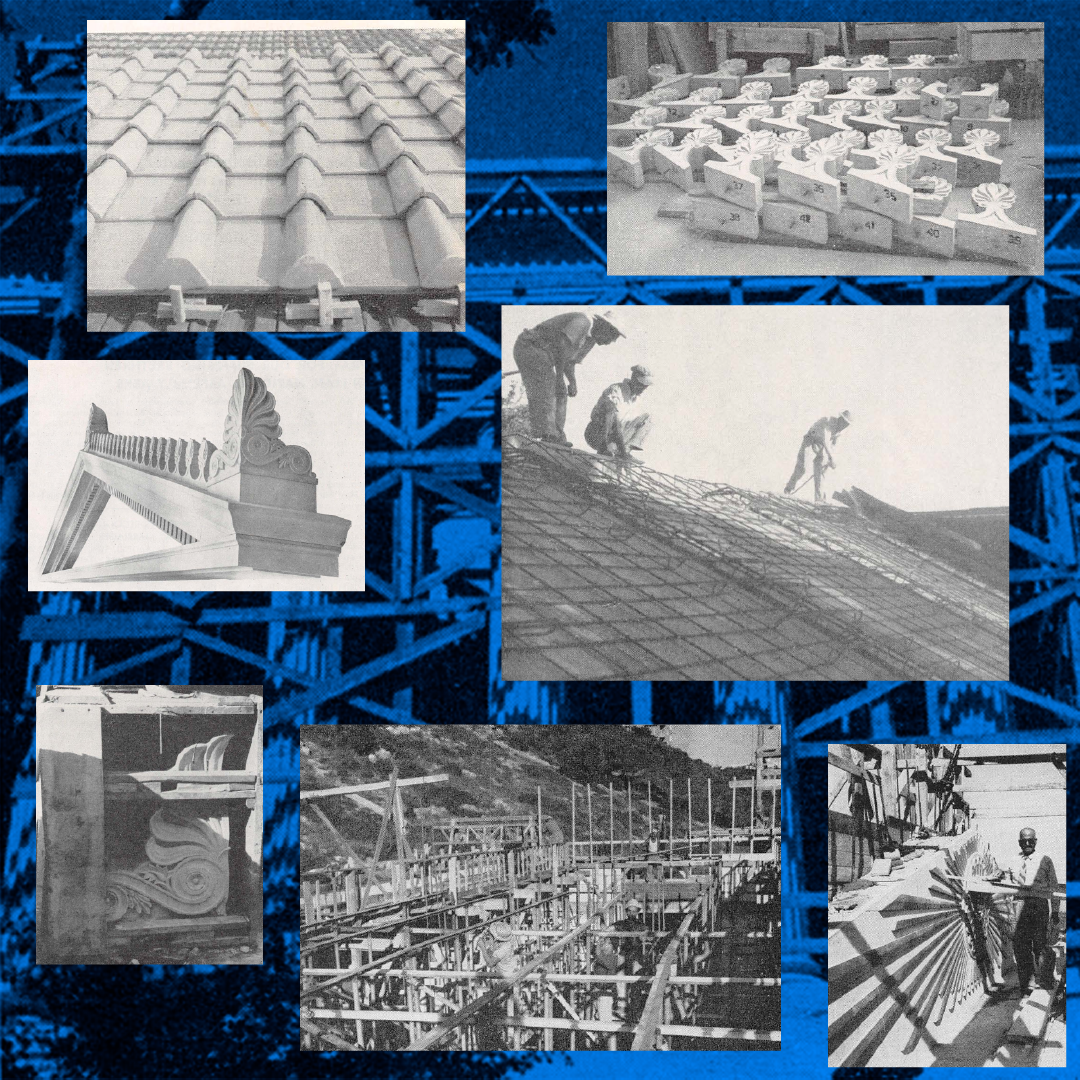 …on the other, through the laying of the foundation, and the erection of some of the pillars, of the facade and of the northern side of the International Bahá'í Archives—the first of the major edifices destined to constitute the seat of the World Bahá'í Administrative Center to be established on Mt. Carmel. No less than thirty of the fifty-two pillars, each over seven meters high, of this imposing and strikingly beautiful edifice have already been raised, whilst half of the nine hundred tons of stone ordered in Italy for its construction have already been safely delivered at the Port of Haifa. A contract, moreover, for over fifteen thousand dollars has been placed with a tile factory in Utrecht for the manufacture of over seven thousand green tiles designed to cover the five hundred square meters of the roof of the building.